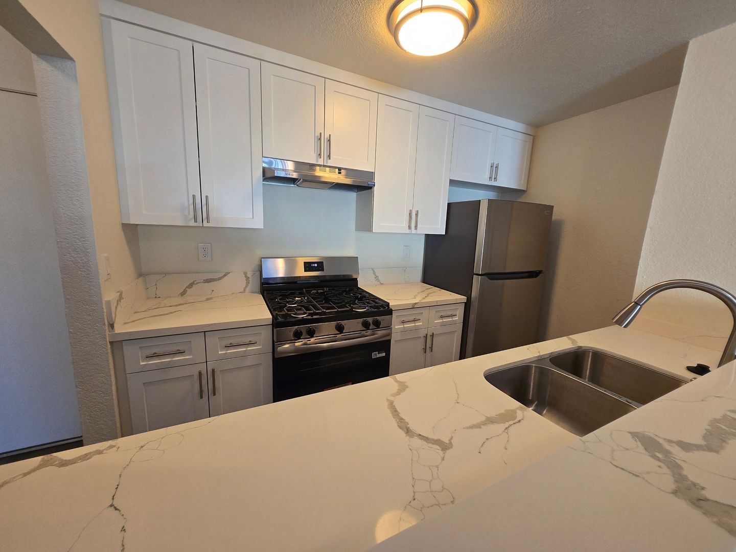 - Fully equipped kitchens with ample cabinetry, refrigerator, gas range, and dishwasher